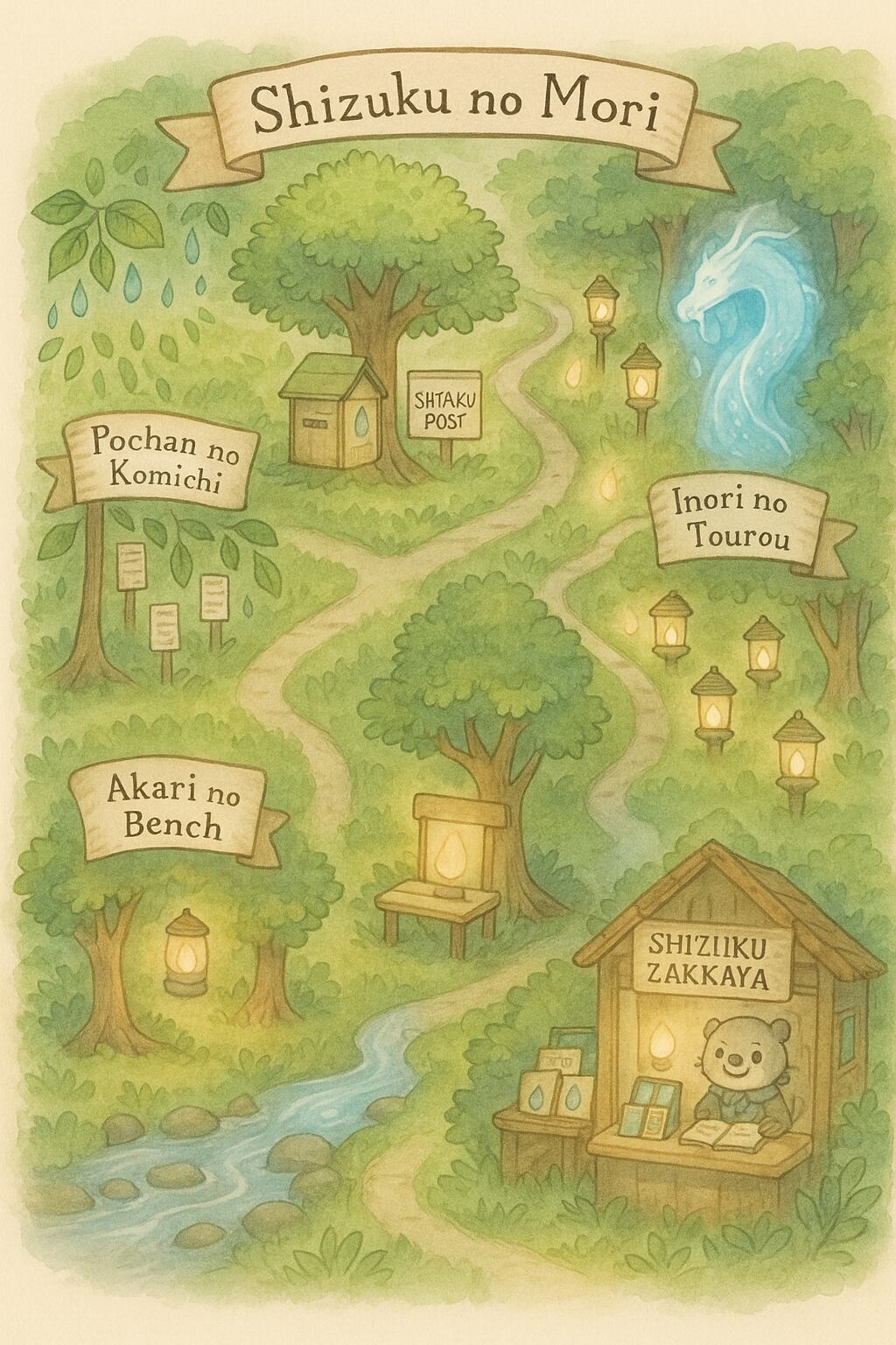 表紙は「しずくの森マップ」中面は左下にしずくのワンポイント+羅線入り。あなたの大切な言葉や心のメモをそっと書き留めてください。